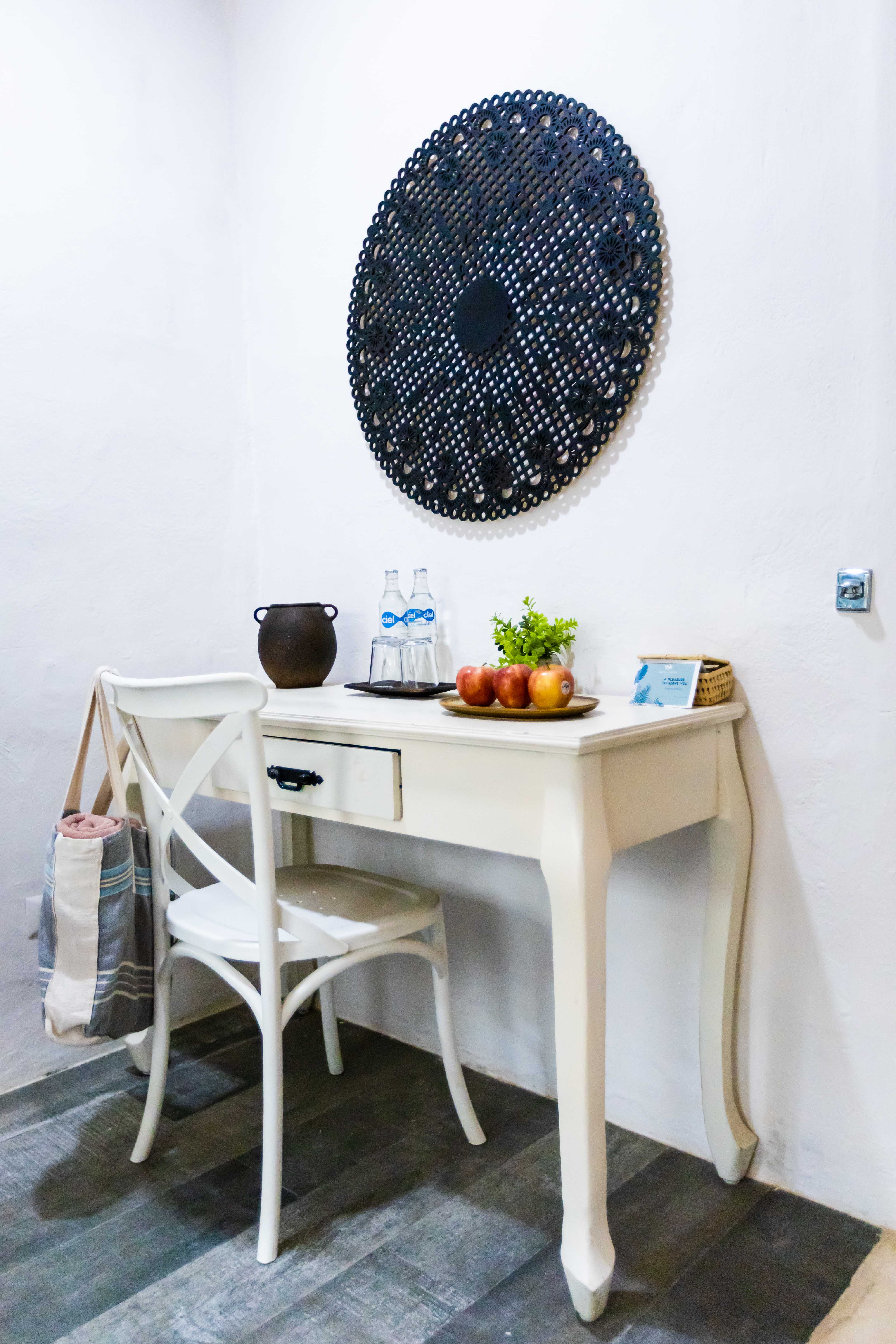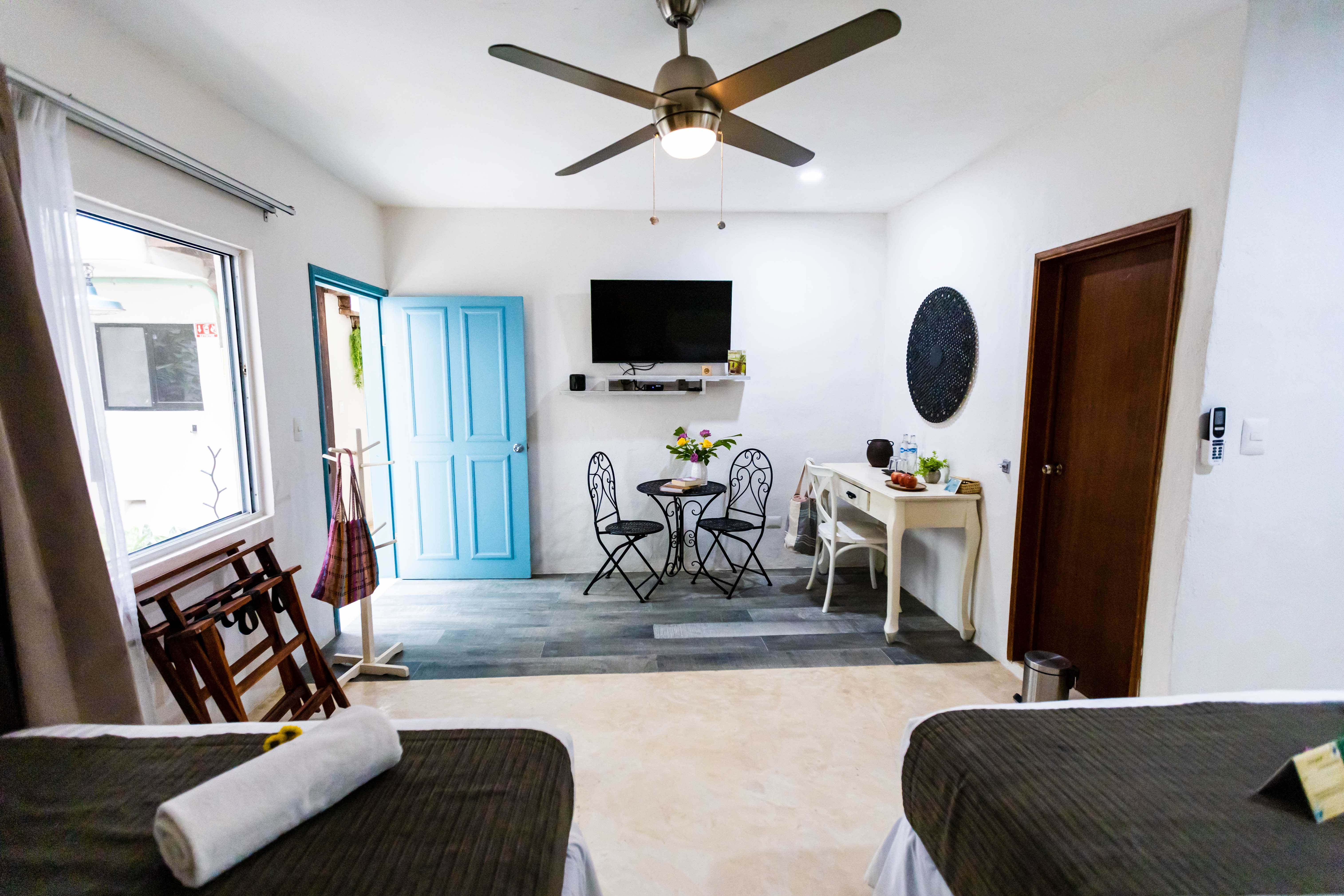Modern and cozy room located on the ground floor, equipped with two double beds, fine sheets and pillows, TV with cable, closet, desk and bathroom.